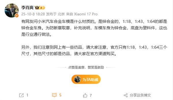 【TechWeb】小米汽车副总裁李肖爽近日通过微博平台,针对网友关心的车模材质问题作出详细回应,并特别提醒消费者注意市场上已出现的小米汽车车模仿品。