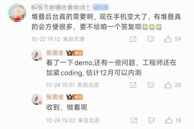 张国权回复得很干脆:“还有些问题,工程师在加紧处理,预计12月开启内测。”