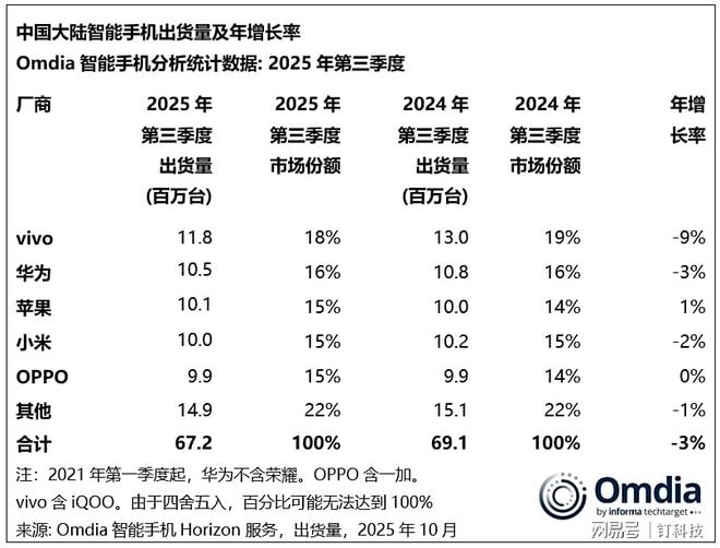而在中国大陆市场,OPPO“掉队”的势头更加明显。Omdia数据显示,第三季度中国大陆市场vivo以1180万台的出货量位居第一,占据18%的市场份额;华为紧随其后,出货量为1050万台,市场份额为16%;苹果延续上涨趋势,出货量为1010万台,挤进前三;小米和OPPO则分别以1000万台和990万台的出货量位列第四和第五。